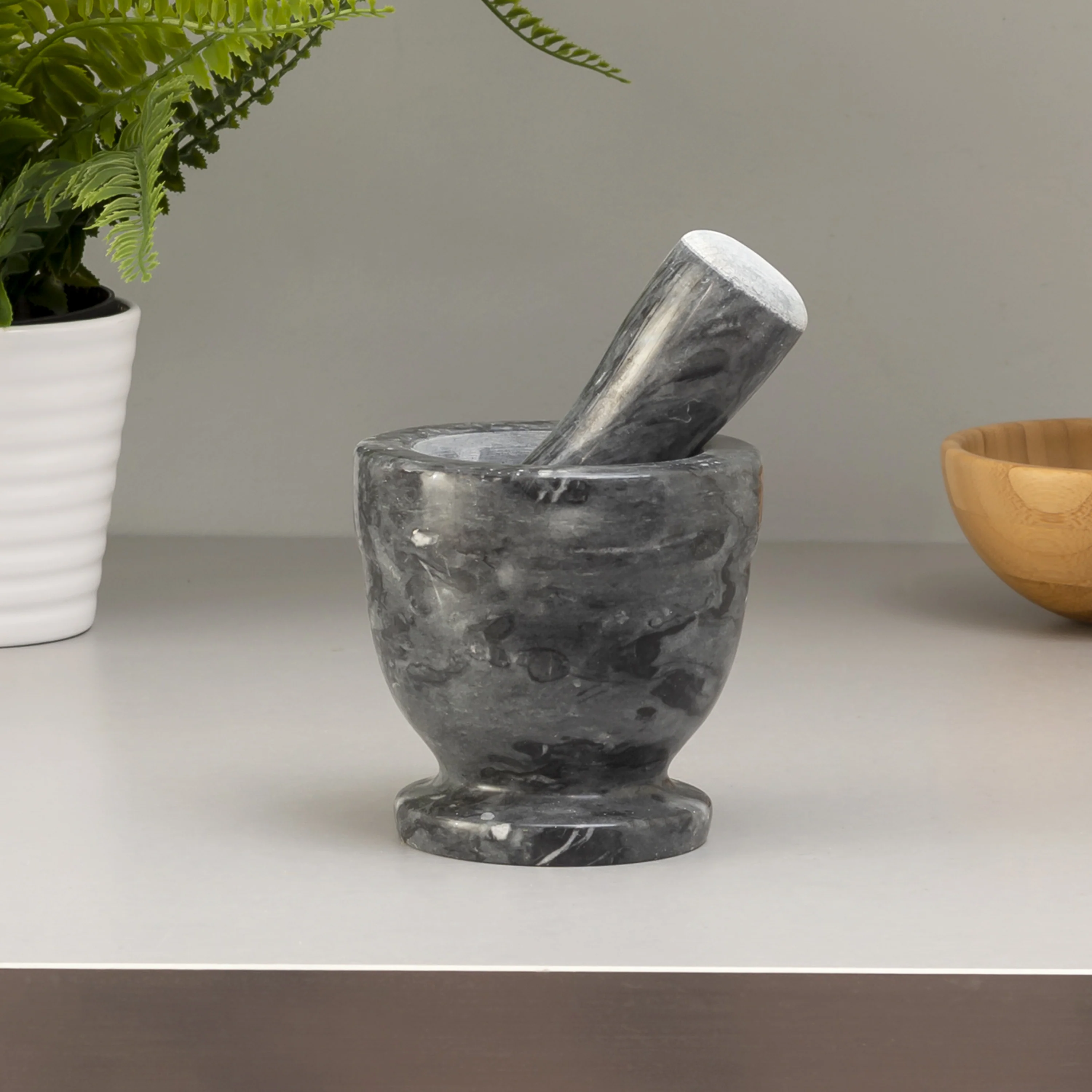 Looking to whip up a creamy guacamole dip or a smooth and savory pesto sauce for your next soiree? Instead of busting out the blender and dealing with the messy aftermath opt to use this marble mortar and pestle to get the job done. The large pestle pulverizes ingredients quickly, unleashing their full flavor with little and minimal effort. Both pieces are crafted from premium stoneware, that is substantial in weight to prevent it from slipping and sliding off your work surface. There is no better way to reveal the aromatic flavors and rich textures of your herbs and spices than to grind them with this mortar and pestle. Please note: No two pieces are the same; They are truly one-of-a-kind. Due to the item’s natural material, shade and color variations will occur. MATERIAL: Marble. SIZE: 3.9x4.1 Inches. COLOR: Black