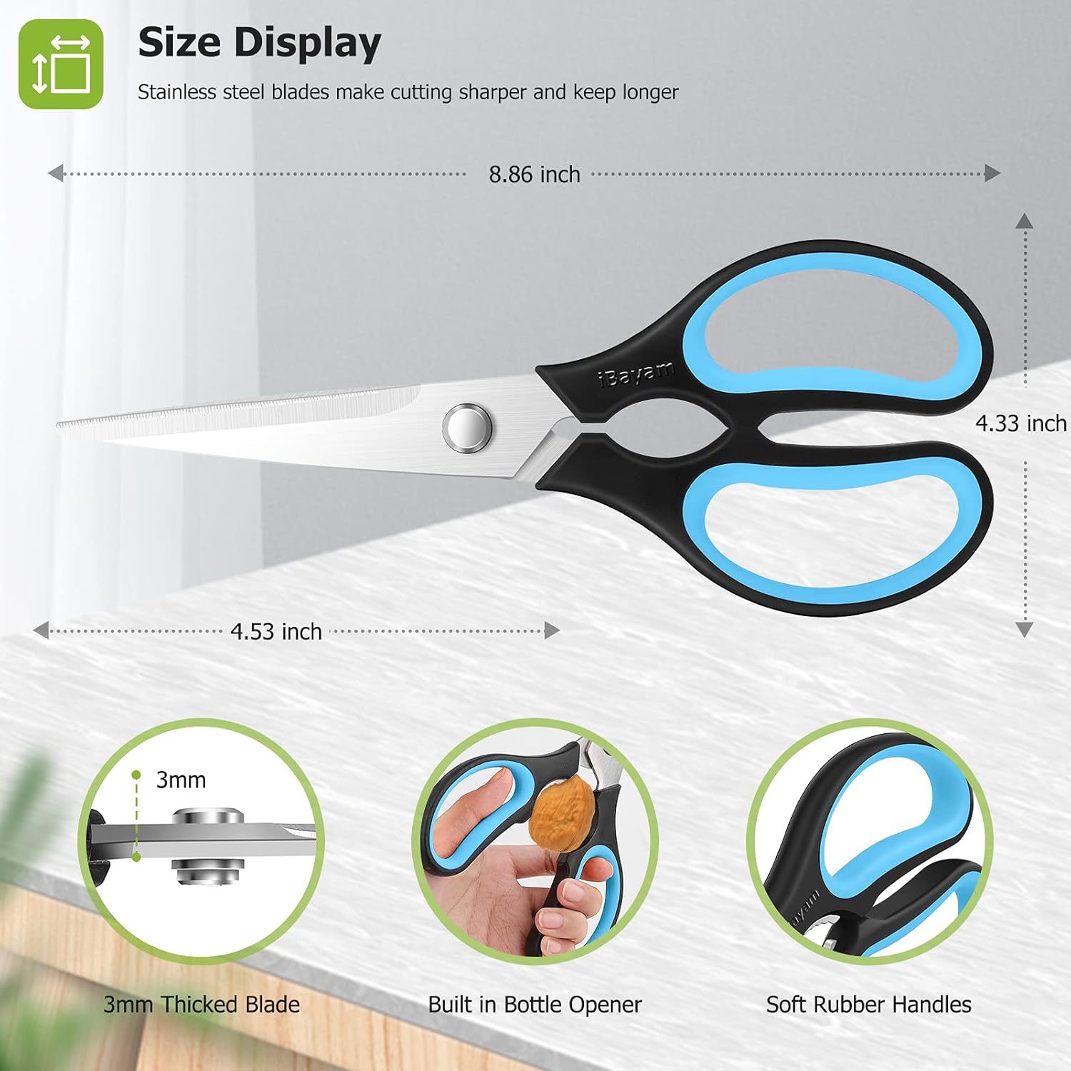 - STAINLESS STEEL SHARP BLADES: Quality hardened stainless steel blades easily cut through cardboard, twine, food, meat, vegetables, chicken, poultry, fish, herbs, seafood, BBQ, food packing bags, and more. Great as Food Scissors, Meat Scissors, Cooking Scissors, Scissors Kitchen, Cooking Shears, Poultry Scissors, Utility Scissors, Meat Cutting Scissors.