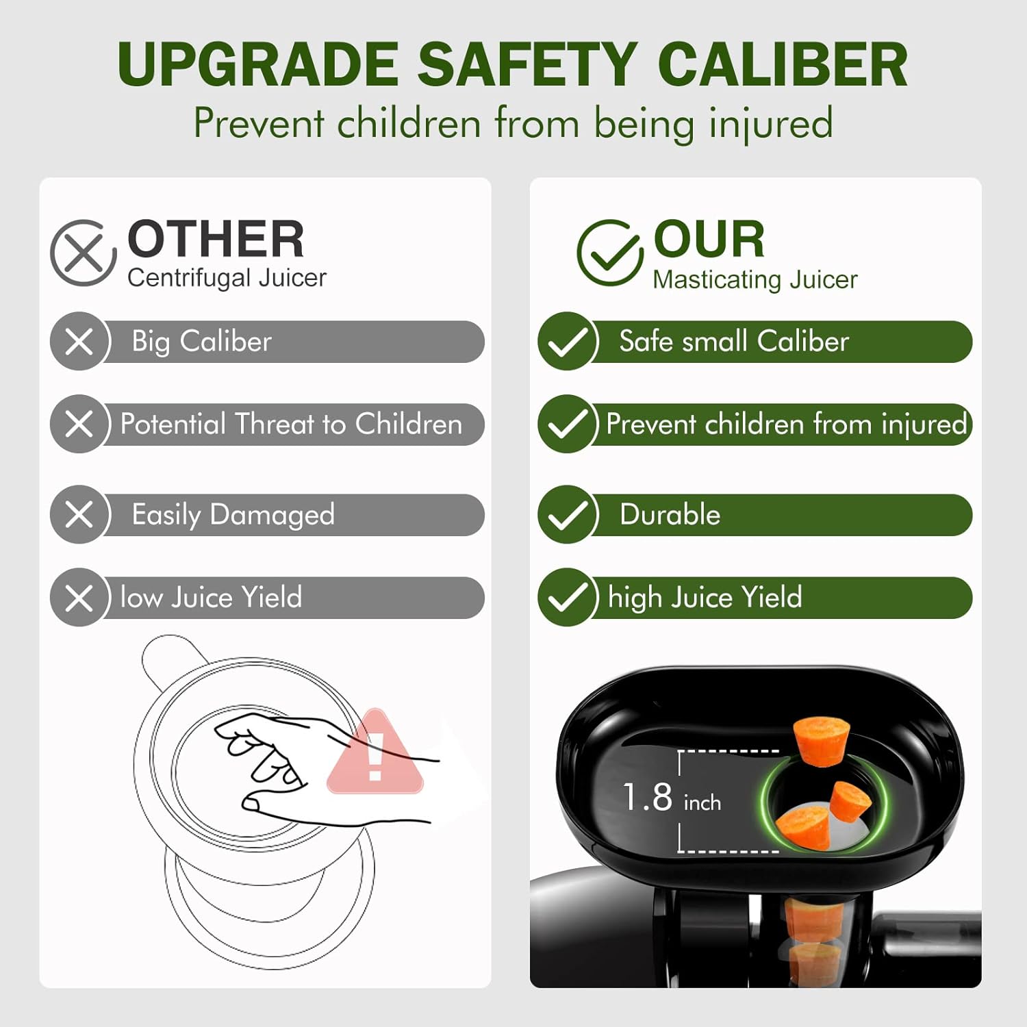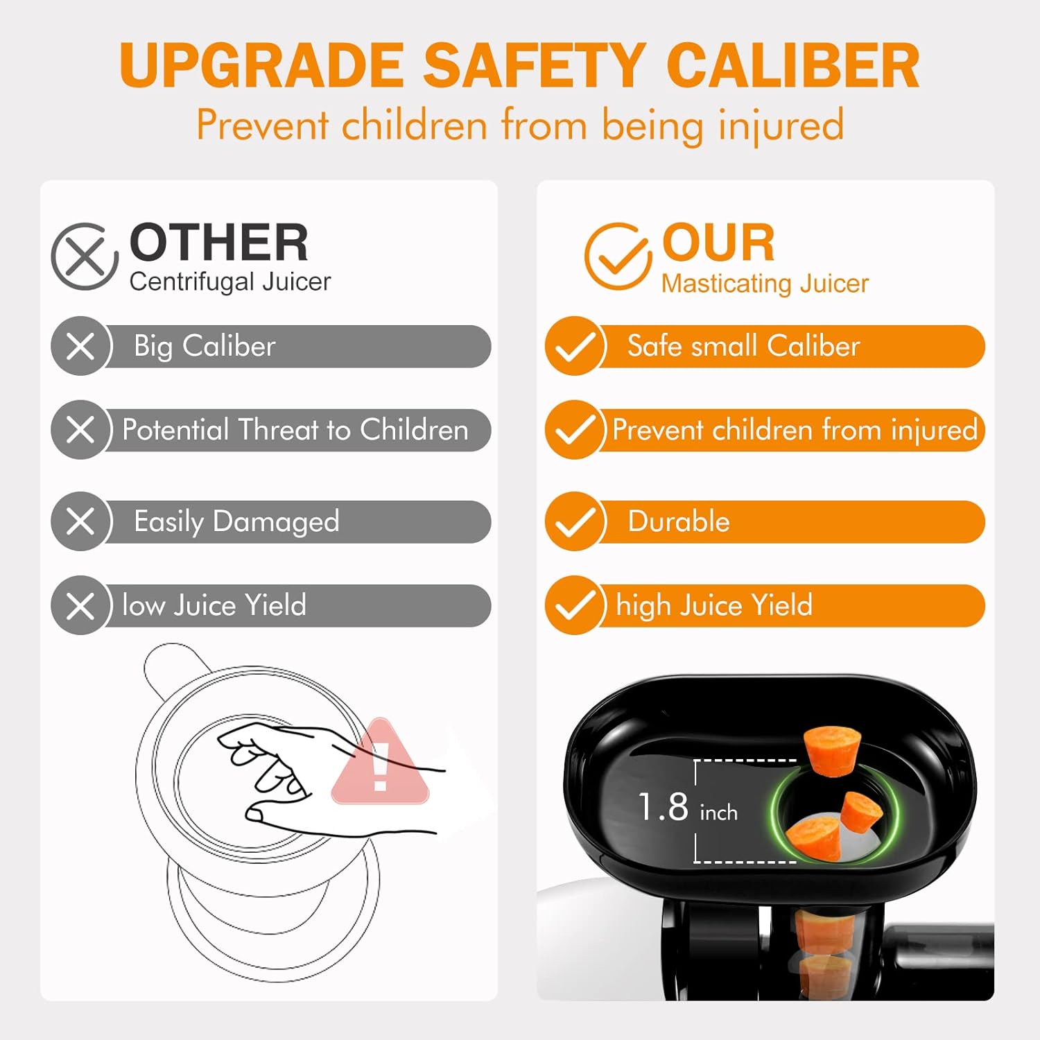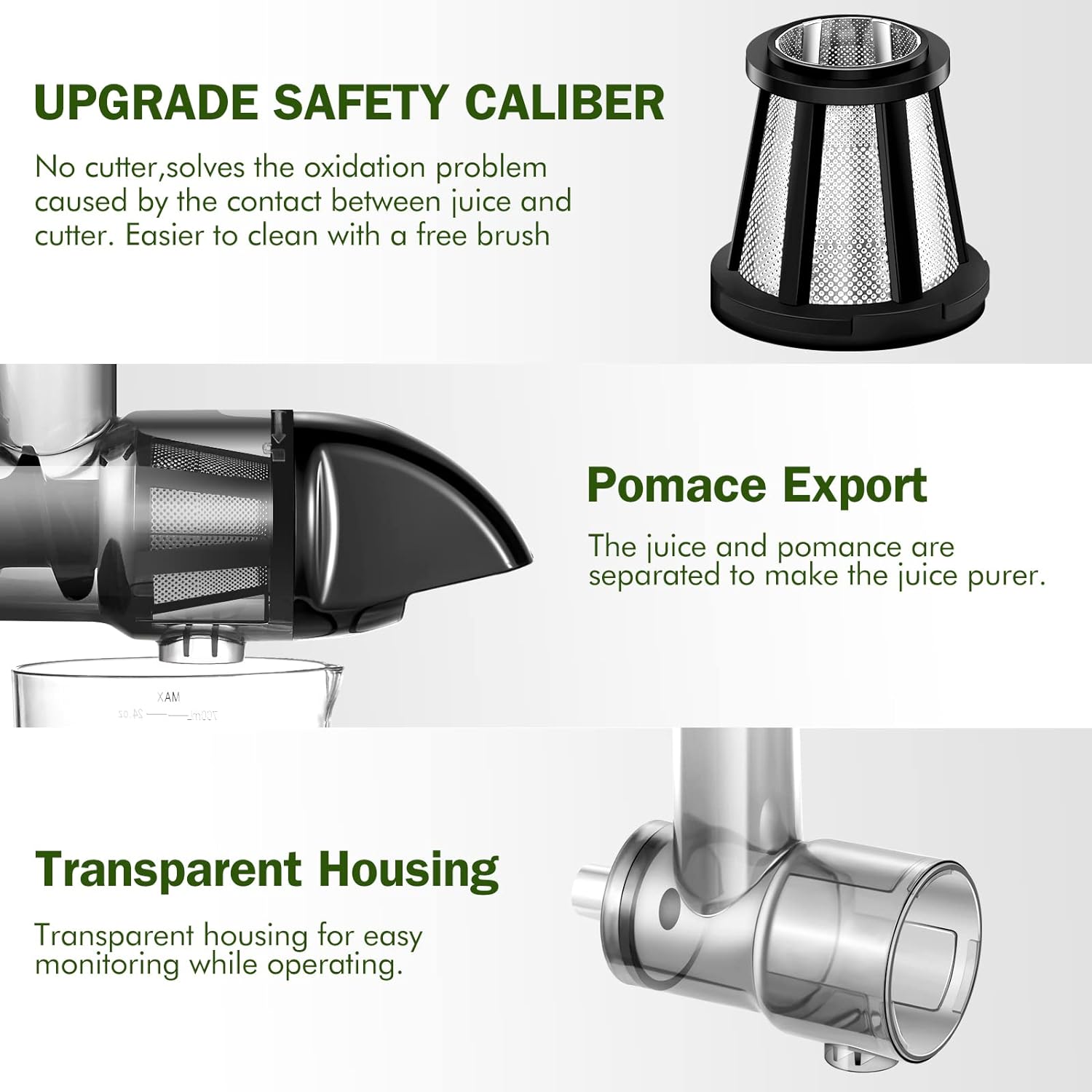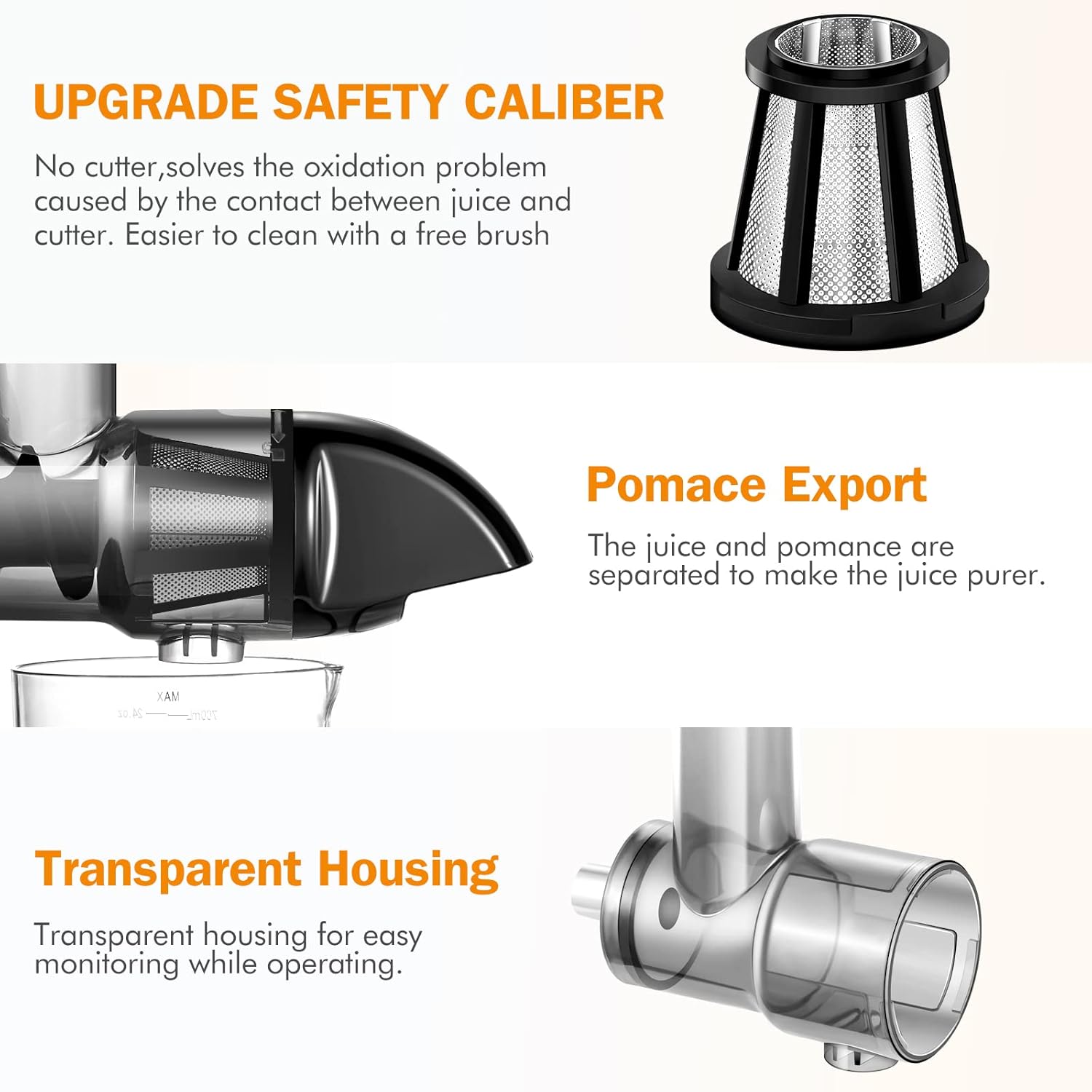 - 🍇【Small Caliber Slow Juicer Extractor】AMZCHEF cold press juicer machines with small feeder chute allows you can remove the seeds when you cytting the fruit to reduce the bitter taste, It can maintain the original taste of the juice. At the same time,slow masticating juicer extractor can prevent children from bring injured during juicing.This humanized design can let you and your whole family make each other's favorite juice with AMZCHEF slow masticating juicer extractor together every moring.