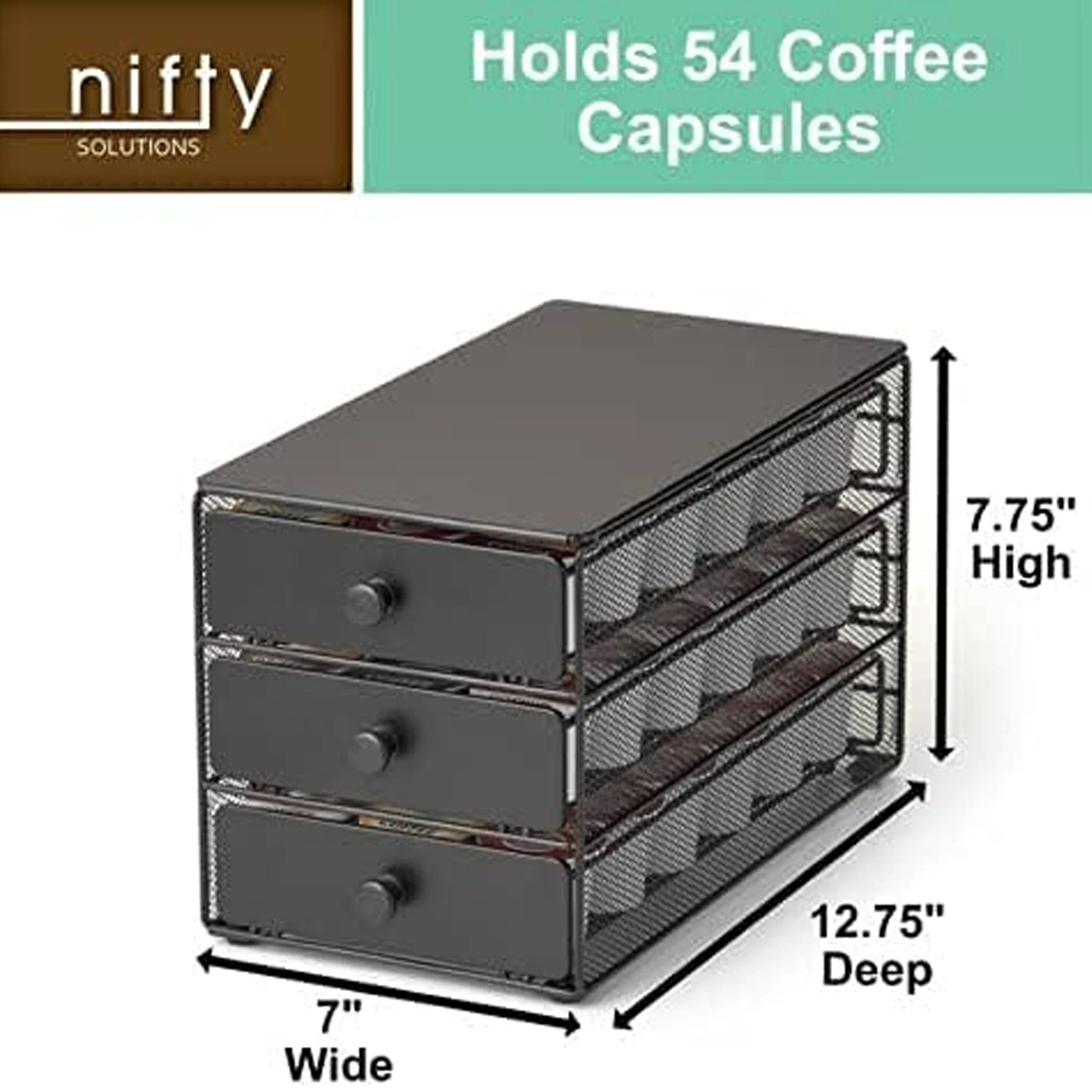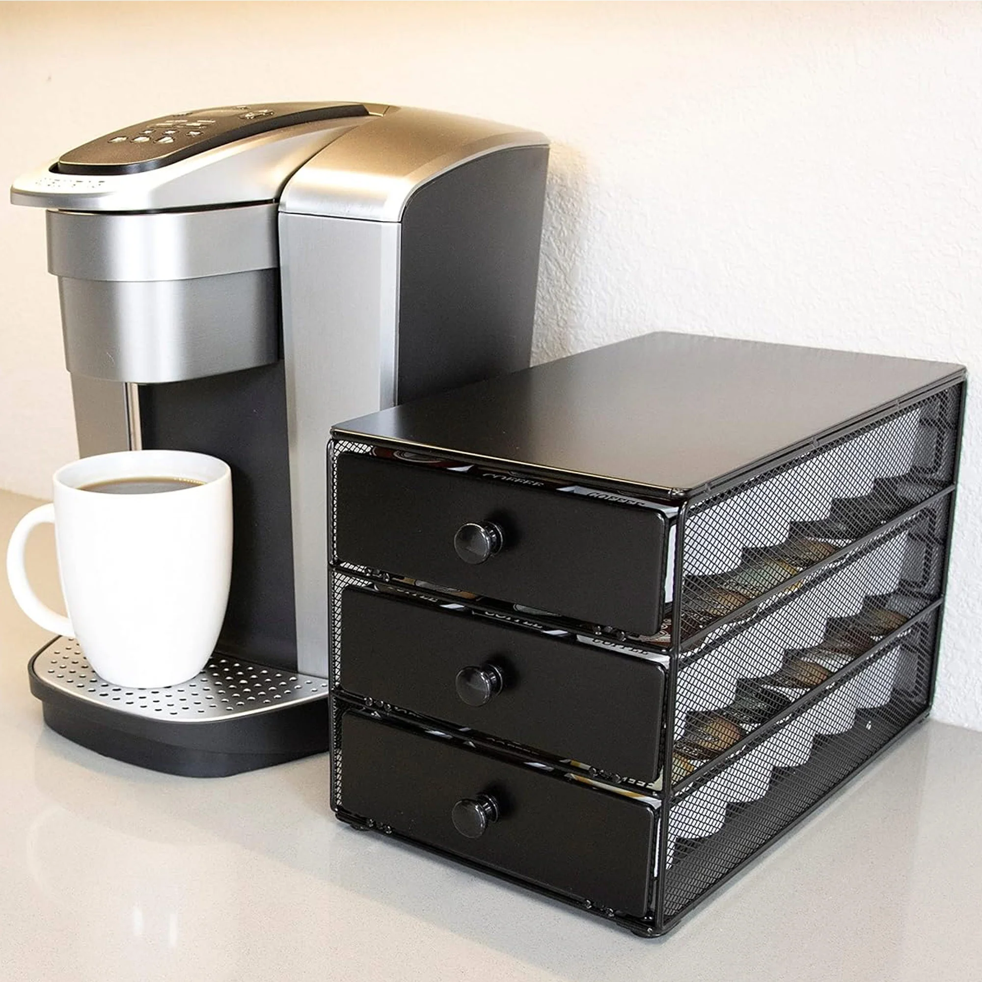 Tame Your K-Cup Chaos with This Sleek Organizer. Banish messy coffee pod drawers with the Black Satin K-Cup Organizer! This stylish three-tier holder lets you store a whopping 54 K-Cups, keeping your favorite flavors organized and within reach. The sleek black satin finish complements any kitchen or office décor, and the compact design maximizes counter space.