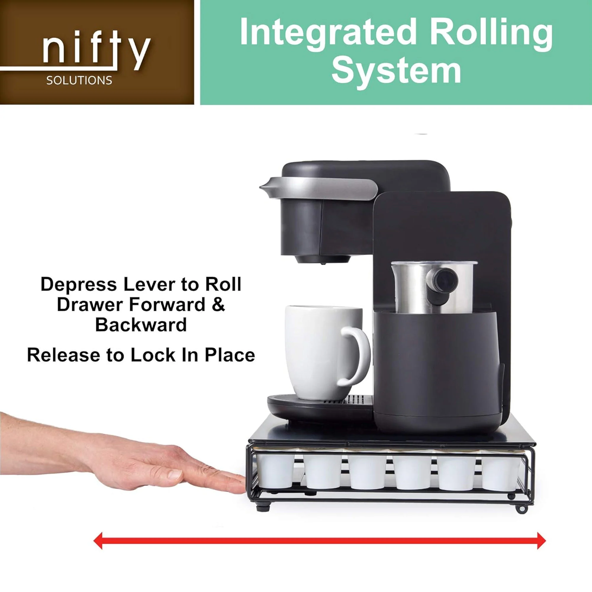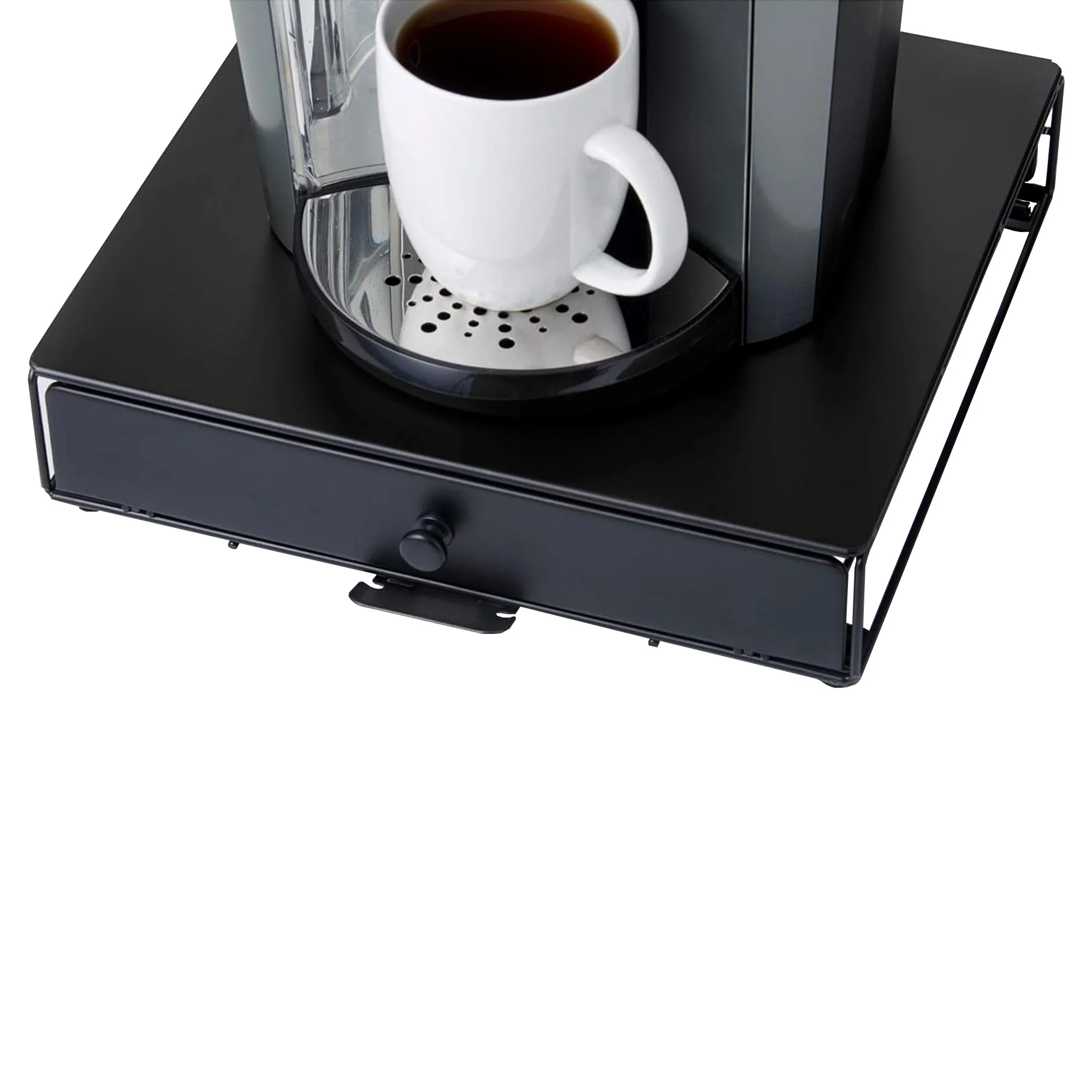 Conquer Counter Clutter with this Coffee Pod Powerhouse. Tired of K-Cups taking over your counter? Reclaim your space with the Compact Under Coffee Pot Storage Drawer! This sleek black organizer holds a whopping 36 K-Cups, keeping your favorite pods within easy reach and your countertop clutter-free.