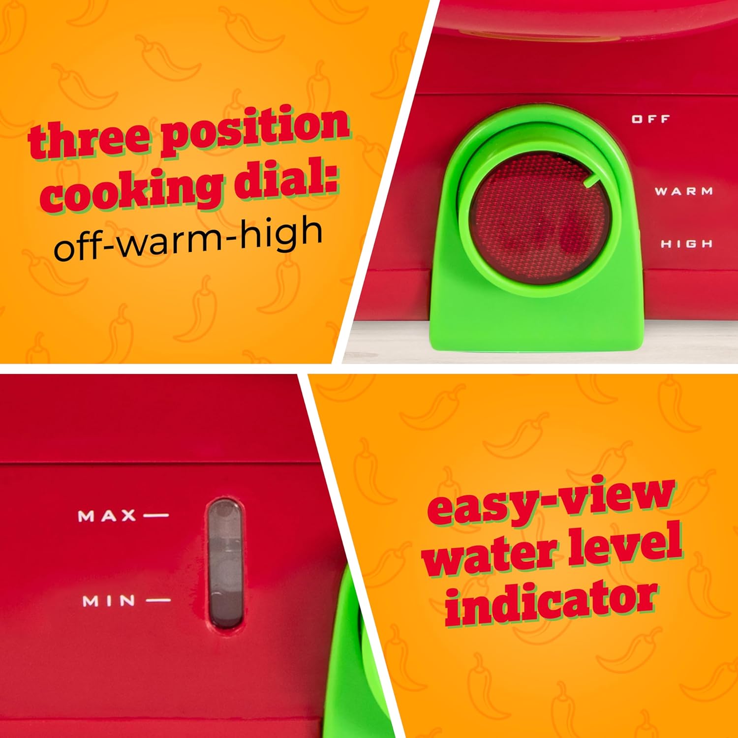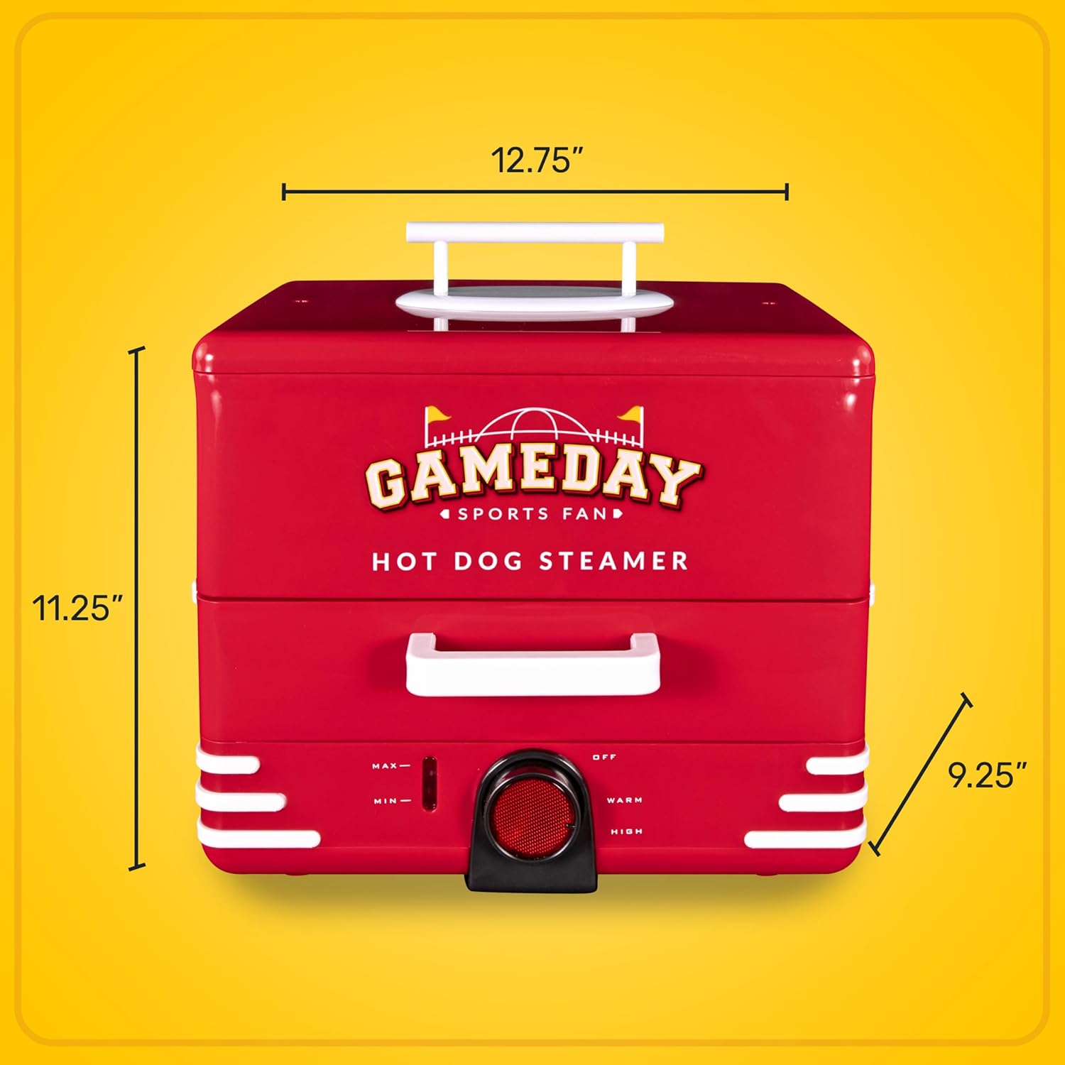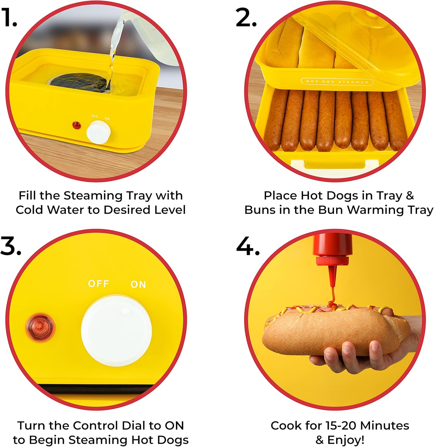 - EASY-TO-USE: 3-position cooking dial (High, Warm and Off) makes cooking effortless - simply add water, put the cover on and turn to High and steamed hot dogs will be ready in 15-20 minutes!