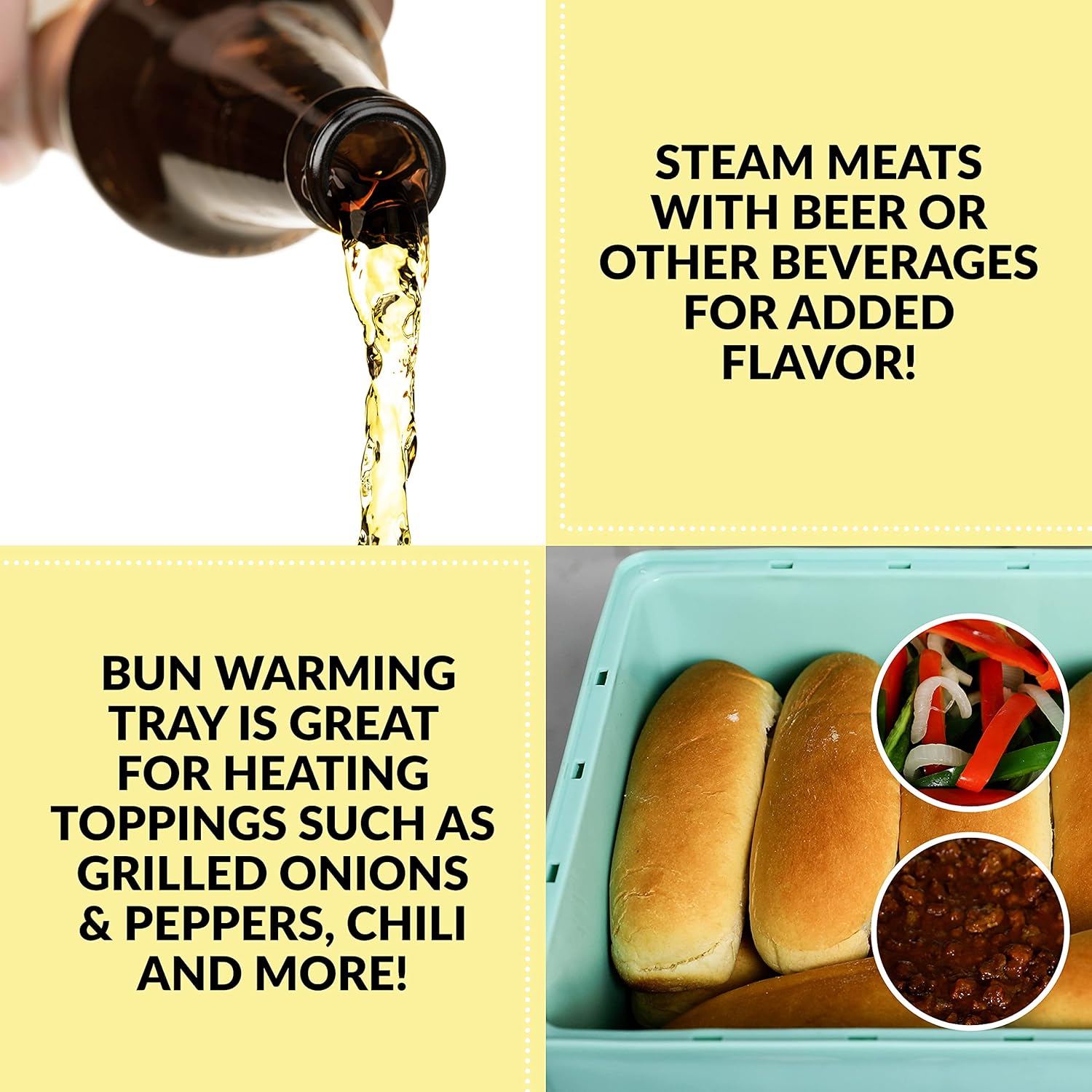 - BUN WARMING TRAY: The bun warmer holds up to 6 buns at a time, keeping them warm and ready to enjoy