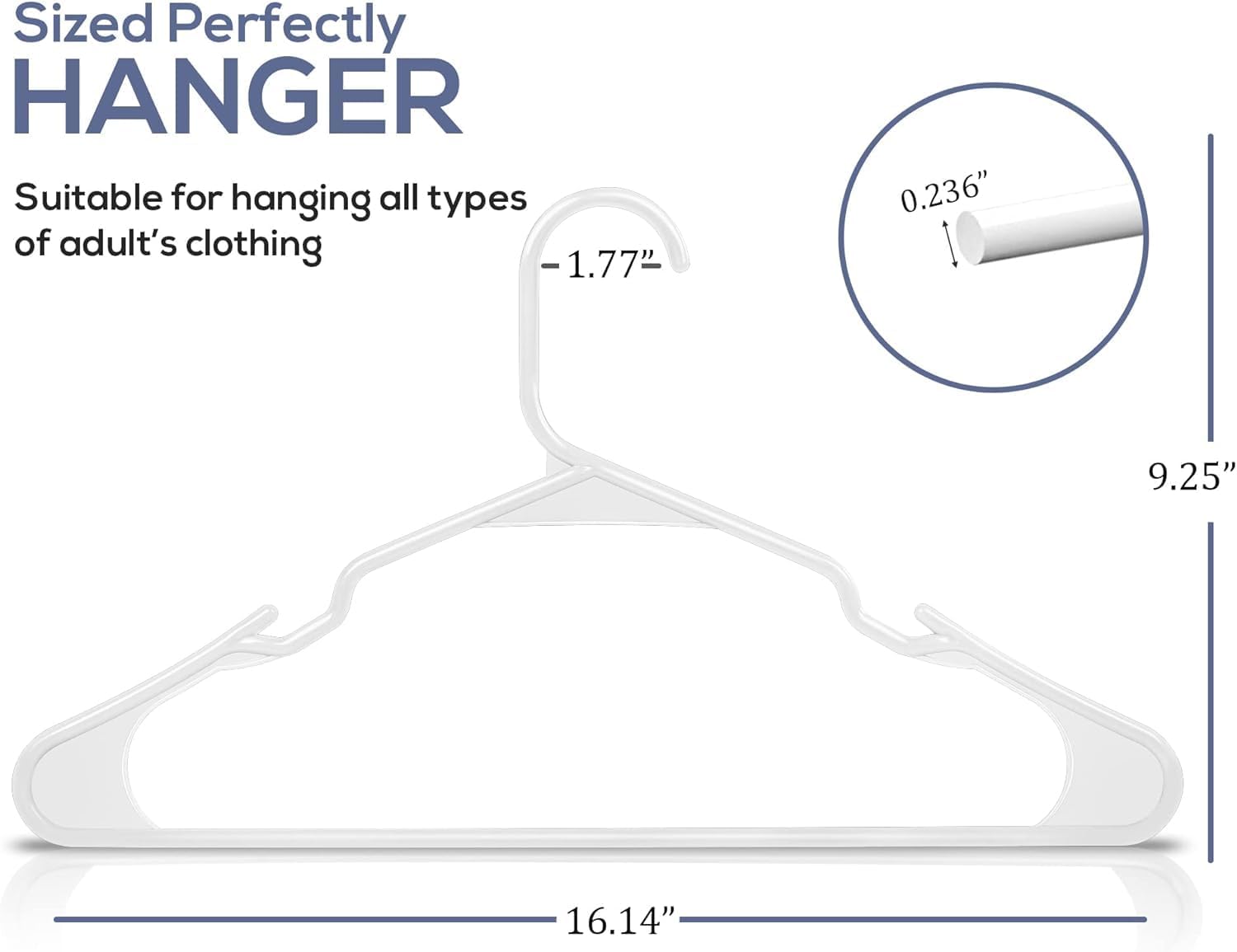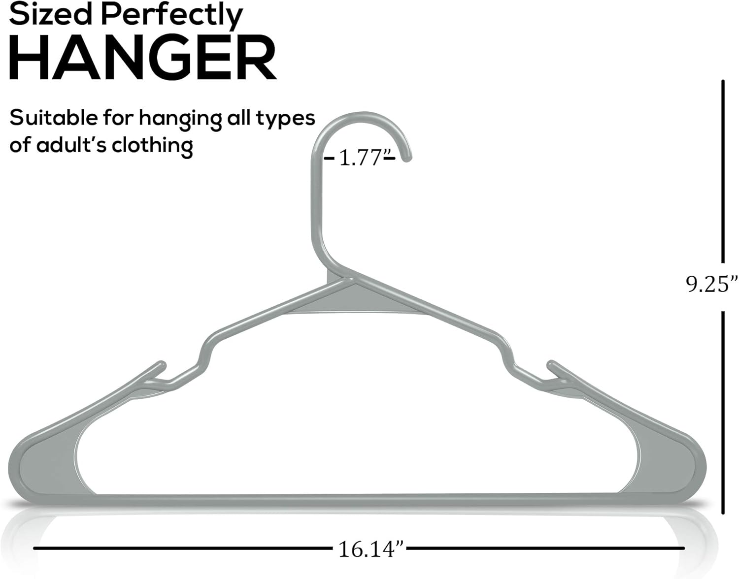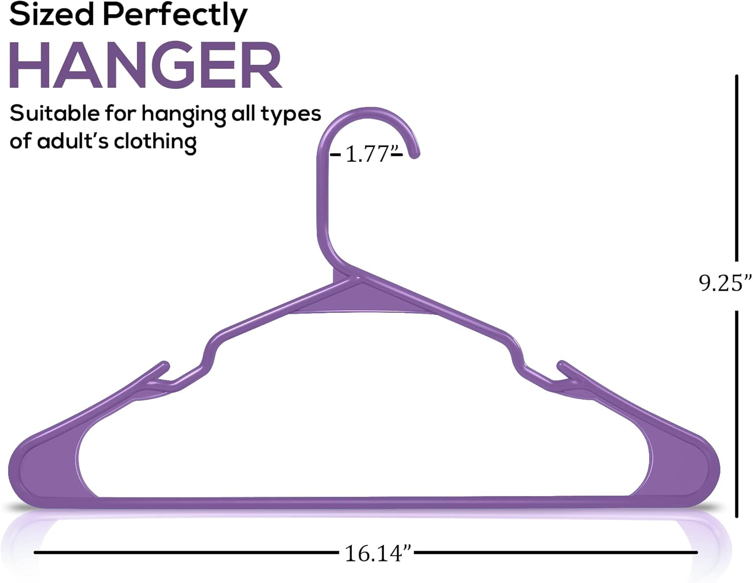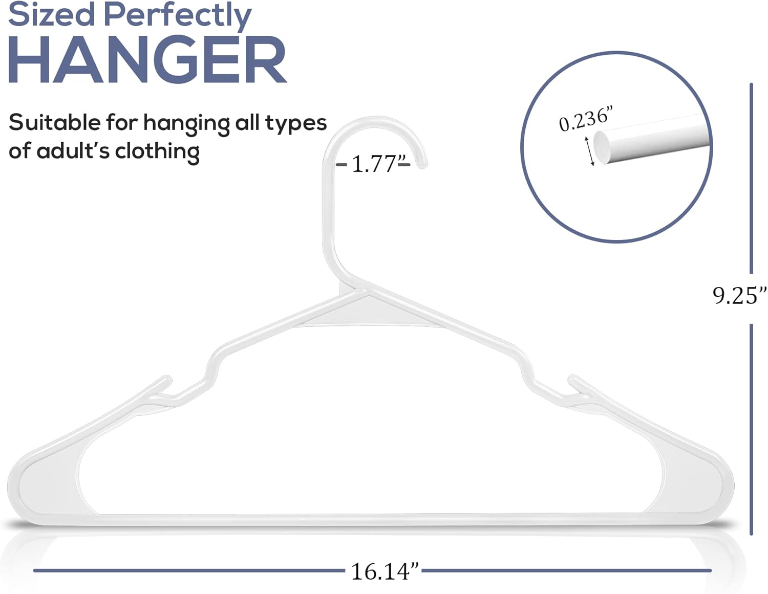 - Plastic Hangers 50 Pack - Pack of plastic hangers for closet organizers and storage with each hanger measuring 16.14 x 0.23 x 9.25 inches.