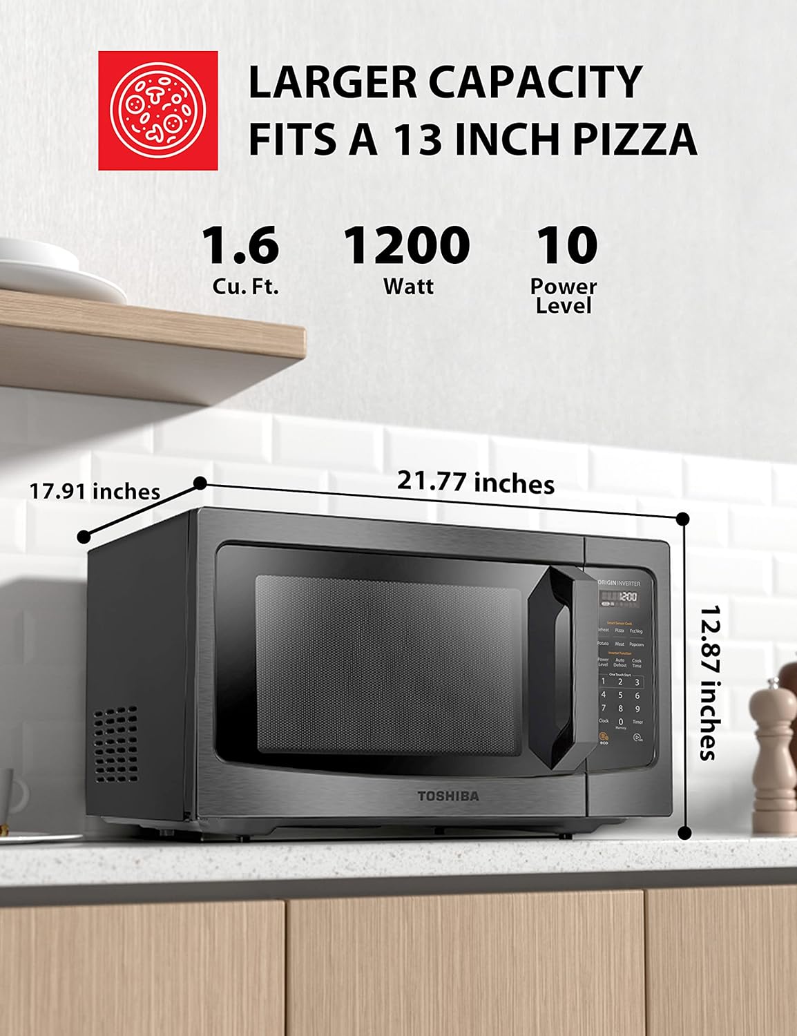 TOSHIBA EM131A5C-BS Countertop Microwave Ovens 1.2 Cu Ft, 12.4" Removable Turntable Smart Humidity Sensor 12 Auto Menus Mute Function ECO Mode Easy Clean Interior Black Color 1100W
