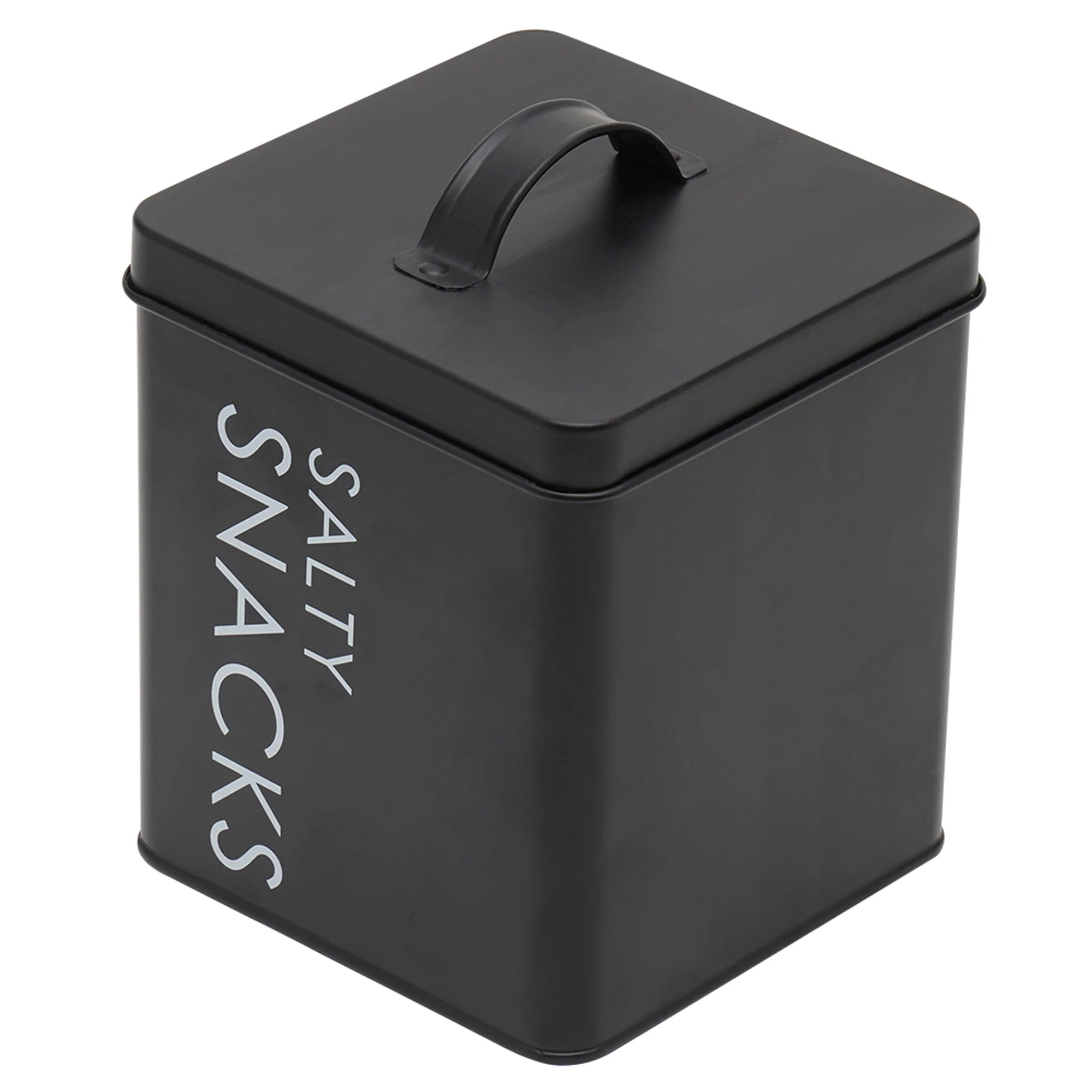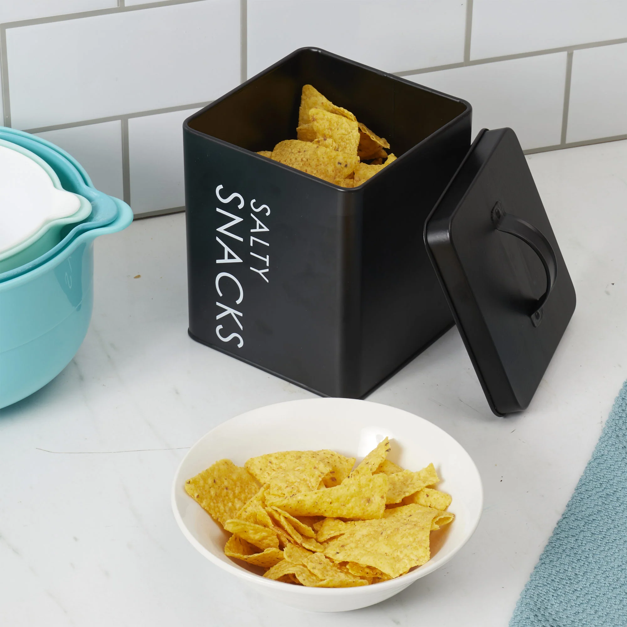 Home Basics Tin Canister, Salty Snacks, Large, Black, 5.5.x5.5x6.5 Inches