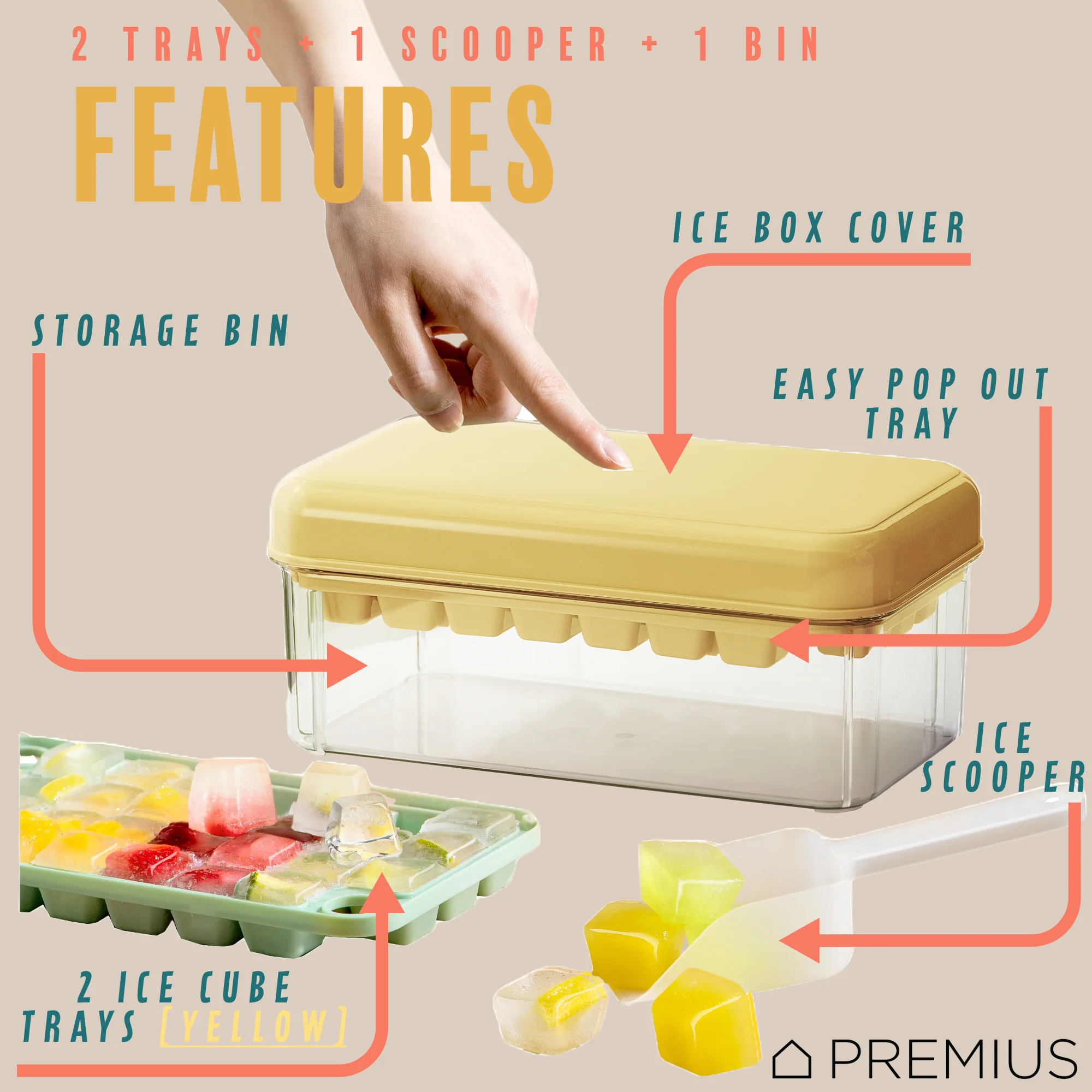 PREMIUS 2 Tray Ice Cube Tray with Container and Scoop, Yellow-Clear
