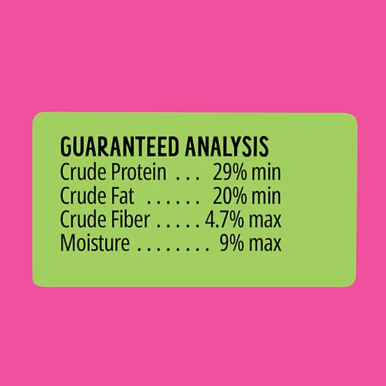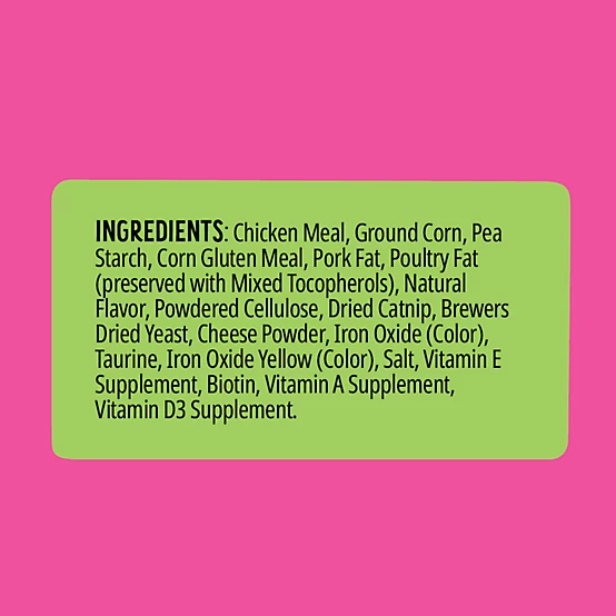 Chicken Meal, Ground Corn, Pea Starch, Corn Gluten Meal, Pork Fat, Poultry Fat (preserved with Mixed Tocopherols), Natural Flavor, Powdered Cellulose, Dried Catnip, Brewers Dried Yeast Cheese Powder, Iron Oxide (Color), Taurine, lron Oxide Yellow (Color), Salt, Vitamin E Supplement, Biotin, Vitamin A Supplement, Vitamin D3 Supplement.