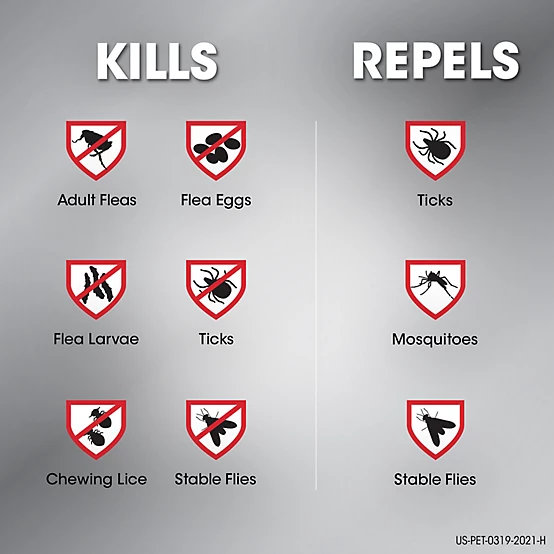 Targeted InsectsFleas, Ticks, Mosquitoes, Mites, Lice, Stable Flies