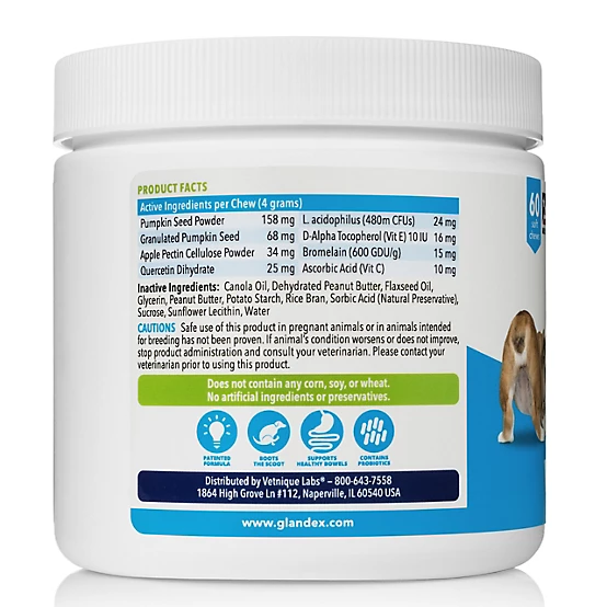 Glandex was created by veterinarians specifically to help support anal gland function in dogs and cats. Glandex Anal Gland Fiber Supplement Soft Chews for Dogs has a patented formula that contains a unique fiber blend, omega fatty acids, probiotics, and digestive enzymes to support digestion, immunity, and seasonal allergies. Glandex supplements come in both soft chews and powders with a variety of flavors that your pet will love. Give the recommended amount daily based on the weight of your pet. Get Glandex dog fiber supplements today, and help your pet finally boot the scoot!